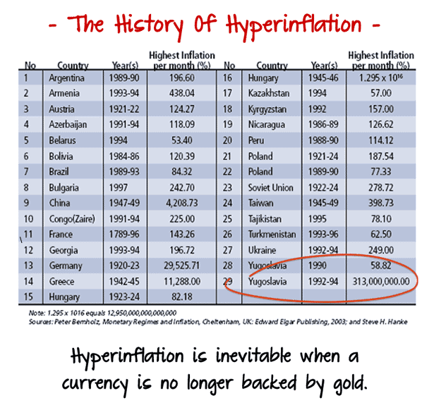 I started this site to share information about my research of Gold IRA companies. Like you, I was looking for a safe place to invest my money in retirement. As you can see in the chart to the right, hyperinflation has plagued many countries and has affected the livelihood of the people that live in those countries. Just